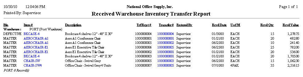 The Received Warehouse Inventory Transfer Report provides information on the receipt of goods transferred from a particular warehouse. This report is useful for tracking the receipt of inventory items transferred to their respective destination warehouses. This report also serves as a reference in reconciling inventory item quantities. You also have an option to show the items’ serial numbers, lot numbers and kit