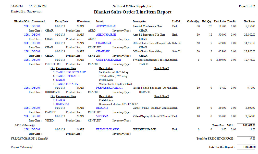 The Released Blanket Sales Order Report provides information on the line item quantities that are released from blanket sales orders. This report provides details on the unit price, the discount given, and the extended price of the line item quantities released from blanket sales orders, among other information. This report is useful for reviewing the quantities released from blanket sales orders and for cross-referencing the blanket sales orders with the sales orders generated upon release of quantities. You can select to include in the report the freight charges and sales tax