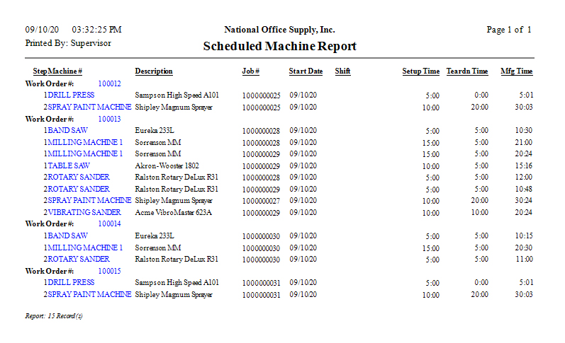The Production Reports provide information that is important in planning and managing the inventory item, machine, and/or labor resources. More specifically, these reports provide information on the work orders that are still in process and the estimated quantities of inventory items and machine or labor resources to complete production. Each of the Production Reports has various options and criteria that provide a wide variety of work order production-related information and report formats. Read the information below to get a closer look at each of the Production Reports available in AccountMate. Projected Material Requirement Report The Projected Material Requirement Report lists the jobs to complete for each component item. This report also provides data on the available quantities, manufacturing quantities, quantities posted to work-in-process, used quantities, and required quantities for each component item. You can refer to this report when managing and prioritizing the production jobs. This report can also help you determine the component items that have insufficient quantities to complete a job as well as the accumulated shortage quantities. You can opt to exclude from the report the component items with negative final net quantity value. You also have the option to include in the report the completed jobs. You may show in the report all the open purchase orders with backorder quantities for the inventory items that are included in the report. ![]() Work-In-Process Report The Work-In-Process Report contains information on the jobs for each work order that is in process. The specific information in this report includes the work order numbers, job numbers, parent item numbers and descriptions, work order level, order date, request date, start date, manufacturing step, work-in-process quantity, and total cost. This report serves as reference in identifying the outstanding work orders and in monitoring the cost of the jobs posted to work-in-process as well as in planning and managing the component resources availability. You can elect to include in the report only the master parent jobs, only the subassembly jobs, or all jobs. ![]() Projected Completion Report The Projected Completion Report provides information on the work-in-process transactions that are posted in AccountMate but are not yet finished. The specific information in this report includes the work order numbers, job numbers, item numbers and descriptions, work order levels, request dates, work-in-process quantities, start dates, average number of days to finish each job, and the estimated date to finish each job. This report comes in handy when you need to know the number of days it takes to complete the work orders that are still in process, when you need to assign priority to the work orders for completion, and when you plan the availability of resources needed to complete the work orders. You can elect to include in the report only the master parent jobs, only the subassembly jobs, or all jobs. ![]() Scheduled Labor Report The Scheduled Labor Report provides information on the required manufacturing time of labor components for each job that is posted to work-in-process. This report displays specific information including work order numbers, manufacturing step levels, labor component numbers and descriptions, job numbers, start dates, work shifts, setup time, teardown time, and manufacturing time. This report is useful in reviewing and planning the labor resources schedule. ![]() Scheduled Machine Report The Scheduled Machine Report provides information on the required manufacturing time of machine components for each job that is posted to work-in-process and when these machine resources are needed. This report displays specific information including work order numbers, manufacturing step levels, machine component numbers and descriptions, job numbers, start dates, work shifts, setup time, teardown time, and manufacturing time. This report is useful in reviewing and planning the machine resources schedule.