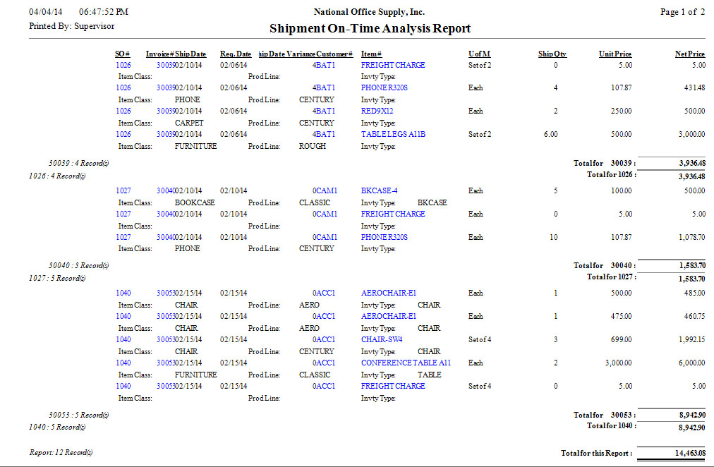 The Shipment On-Time Analysis Report provides information on the shipment lead time, which means the number of days it takes to ship a sales order from the date the order is placed. The Ship Date Variance column in the report displays the lead time in man-days. The information in this report provides data for analyzing the timeliness of sales order shipments. This report is useful in determining your efficiency in shipping sales orders on time. You can choose to include freight charge and adjustment amounts in the report. Options