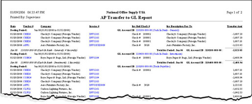 The GL Transfer Report provides an essential audit trail for data transferred to the General Ledger module. This report can also be used to verify the system-generated journal entries after recording a transaction in the AP and PO modules, and helps determine the cause for an out-of-balance scenario when closing the period or transferring data to the General Ledger.
