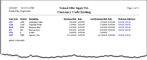 The Currency Code Listing provides information on each currency code including its symbol description, current exchange rate, and the posting GL Account IDs for the foreign exchange gains/losses. The currency codes are set up through the Currency Code Maintenance function. This report can be used to determine the correctness of each currency code's assigned foreign exchange gain/loss GL Account IDs and to ensure that the exchange rates are up to date.