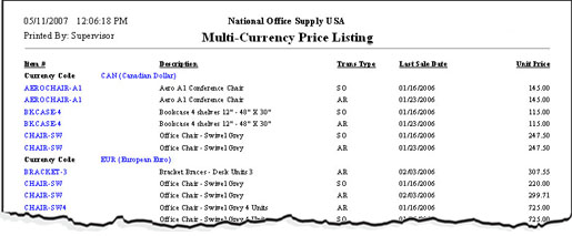 The Multi-currency Price Listing provides information on each item's prices in any of the various currencies set up in AccountMate. This report is useful for reviewing the prices, in specific currencies, used in the last sales order or invoice created for each inventory item.