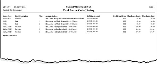 If you need summary information of the paid leave records set up in AccountMate, generate the Paid Leave Code Listing. Aside from the accrual method, this report displays the tier, which represents an employee classification that may be based on seniority, position, or any other basis that your company has set for granting paid leave benefits. This report also provides information on the minimum work hours required to qualify for the accrual; hours accrued per pay period, per hour worked, or per year; maximum leave hours that may be claimed in a year; maximum leave hours that can be carried over to the following year; and the GL Account ID to which the system will record the obligation arising from the paid leave time accrual. This report is most useful when you need to review the parameters set up for each paid leave code in order to help ensure accuracy of system-calculated paid leave time accrual and available balances.