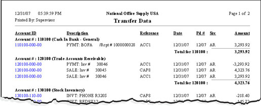 The Transfer Data report provides information on all transactions transferred to the General Ledger from the various integrated subsidiary modules. This report includes all the transactions transferred to the General Ledger when performing period-end closing and transfer data to GL in the subsidiary modules. This report provides an audit trail and must be printed prior to closing the fiscal year in the General Ledger. This report is useful for verifying the completeness of the transferred data from the subsidiary modules to the General Ledger, and serves as reference for determining the source module and the transactions' posting periods.