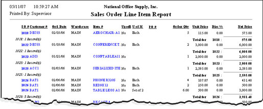 The Sales Order Line Item Report provides detailed information on each sales order's or sales quote's line items including the sales order numbers, customer numbers, order dates and source warehouses as well as the inventory items' numbers, units of measurement, order quantities, unit prices, discount rates, and net prices. This report is useful in reviewing the correctness of sales order or quote information and determining the inventory items that are saleable during a specified period.