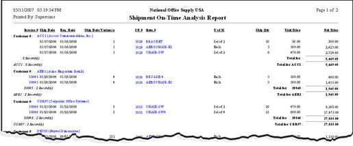 The Shipment On-Time Analysis Report provides information on the shipment lead time, which is the number of days it takes to ship a sales order from the date the order is placed. The Ship Date Variance column in the report displays the lead time in man-days. The information in this report provides data for analyzing the timeliness of sales order shipments. This report is useful in determining your efficiency in shipping sales orders on time.
