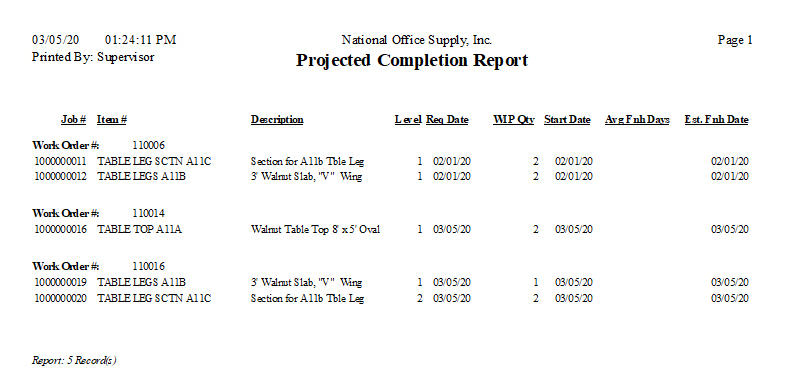 The Projected Completion Report provides information on the work-in-process transactions that are posted in AccountMate but are not yet finished. The specific information in this report includes the work order numbers, job numbers, item numbers and descriptions, work order levels, request dates, work-in-process quantities, start dates, average number of days to finish each job, and the estimated date to finish each job. This report comes in handy when you need to know the number of days it takes to complete the work orders that are still in process, when you need to assign priority to the work orders for completion, and when you plan the availability of resources needed to complete the work orders. You can elect to include in the report only the master parent jobs, only the subassembly jobs, or all jobs.