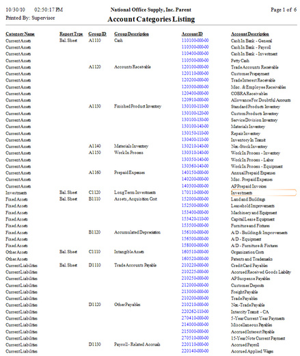 The Account Balance Report provides information on the GL Account ID balances either for each period or a range of periods. The year-to-date Account Balance report displays each GL Account ID's cumulative balance at the end of every selected period while the period-to-date report displays the GL account ID's balance for each period only. This report is useful for analyzing accounts for consistency, detecting pattern of changes for each GL account balance over a period and as a reference in preparing periodic forecasts. You can select to generate this report using the period-to-date or year-to-date option. You can also opt to include zero balance accounts in this report. Account Categories Listing
