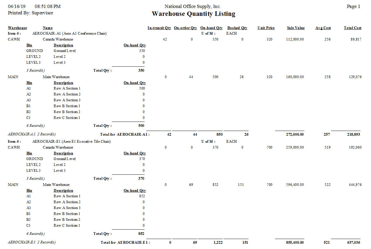 ![]() The Warehouse Quantity Listing provides information on inventory item quantities in each of the warehouses created in AccountMate. This report is useful for determining which inventory items are stored in each warehouse, among other details. You can use this report as reference in managing the inventory items; particularly in determining each inventory item's current volume level, availability, and movement within a specific warehouse. You have the option to show the inventory items’ average and total costs as well as to show the sales prices and sales values. You also have the option to show the inventory items’ serial, lot, and kit numbers, if applicable. You can elect to exclude from the report the inventory items with zero on-hand quantities and those with zero total cost. You can filter the report to include only the items that are designated for use in invoices/sales orders, only those designated for use in purchase orders, only those designated for use in work orders, or all items that meet the specified criteria. You can further filter the report to include only the inventory items assigned with the active status, only the inactive items, or all items regardless of their status. Inventory Cost Listing