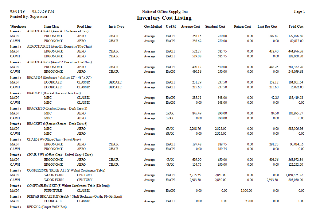 The Inventory Item Listing provides basic information about the inventory items. This report shows the item numbers and descriptions, class, product line, type, units of measurement, status, cost method, standard cost per unit, last sale price, among other pieces of information. This report helps you monitor the inventory items and determine the physical location of each item. It also serves as reference when creating new inventory item records.