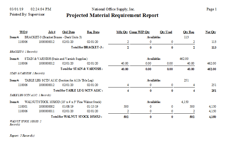 The Projected Material Requirement Report lists the jobs to complete for each component item. This report also provides data on the available quantities, manufacturing quantities, quantities posted to work-in-process, used quantities, and required quantities for each component item. You can refer to this report when managing and prioritizing the production jobs. This report can also help you determine the component items that have insufficient quantities to complete a job as well as the accumulated shortage quantities. You can opt to exclude from the report the component items with negative final net quantity value. You also have the option to include in the report the completed jobs. You may show in the report all the open purchase orders with backorder quantities for the inventory items that are included in the report.
