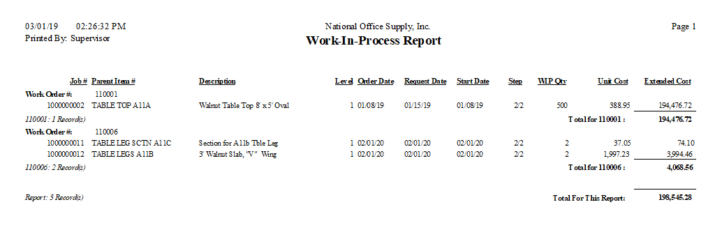 The Work-In-Process Report contains information on the jobs for each work order that is in process. The specific information in this report includes the work order numbers, job numbers, parent item numbers and descriptions, work order level, order date, request date, start date, manufacturing step, work-in-process quantity, unit cost, and extended cost. This report serves as reference in identifying the outstanding work orders and in monitoring the cost of the jobs posted to work-in-process as well as in planning and managing the component resources availability. You can elect to include in the report only the master parent jobs, only the subassembly jobs, or all jobs.