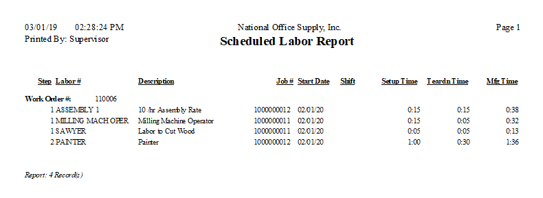 The Scheduled Labor Report provides information on the required manufacturing time of labor components for each job that is posted to work-in-process. This report displays specific information including work order numbers, manufacturing step levels, labor component numbers and descriptions, job numbers, start dates, work shifts, setup time, teardown time, and manufacturing time. This report is useful in reviewing and planning the labor resources schedule.