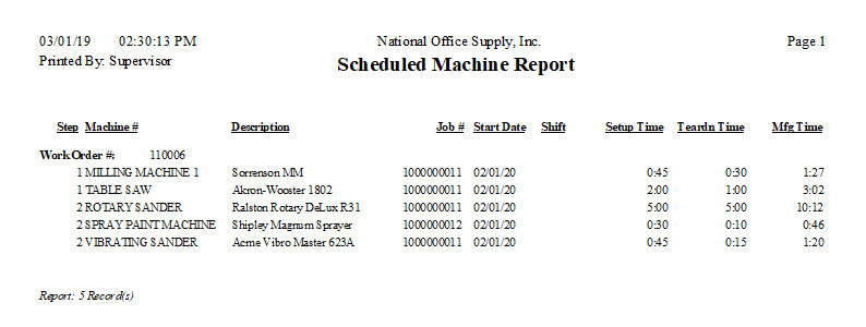 The Scheduled Machine Report provides information on the required manufacturing time of machine components for each job that is posted to work-in-process and when these machine resources are needed. This report displays specific information including work order numbers, manufacturing step levels, machine component numbers and descriptions, job numbers, start dates, work shifts, setup time, teardown time, and manufacturing time. This report is useful in reviewing and planning the machine resources schedule.
