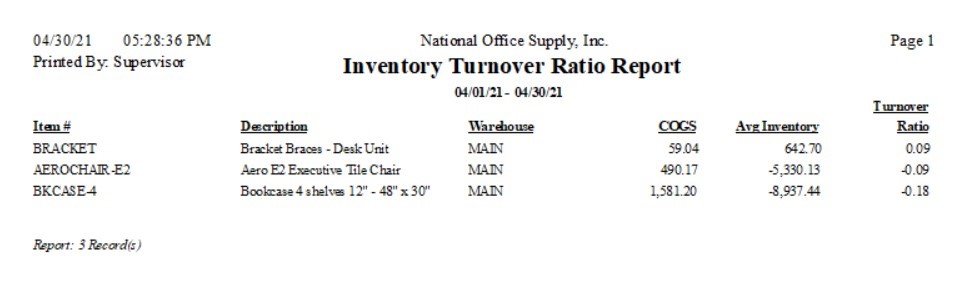 The Inventory Turnover Ratio Report provides information on the inventory turnover ratio, which is determined as the cost of goods sold in a specific period divided by the average inventory for that period. This report is very useful in determining the company's effectivity in selling the inventory it buys and the liquidity of the company's inventory. You can opt to include in the report the shipments that are yet to be invoiced. You can also opt to include the archived inventory items. This report can be generated only for active items, only for inactive items, or all inventory items regardless of their status. You can further filter the report to include only the items with sales activities, only the items with no sales activities or all inventory items regardless of whether these were sold or not within the specified period.
