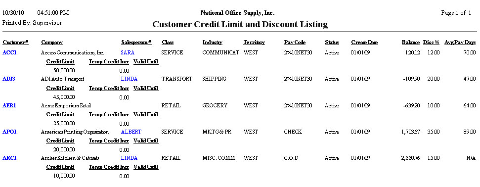 The Customer Listing provides detailed information of your customers including company names, aliases and websites as well as the contact persons and currency codes used. You can use this report as a reference of your customer base. You can generate this report for active customers only, inactive customers only or all customers. You can also select to include in the report the remarks specified on the customer record's Notepad tab. Customer Credit Limit and Discount Listing