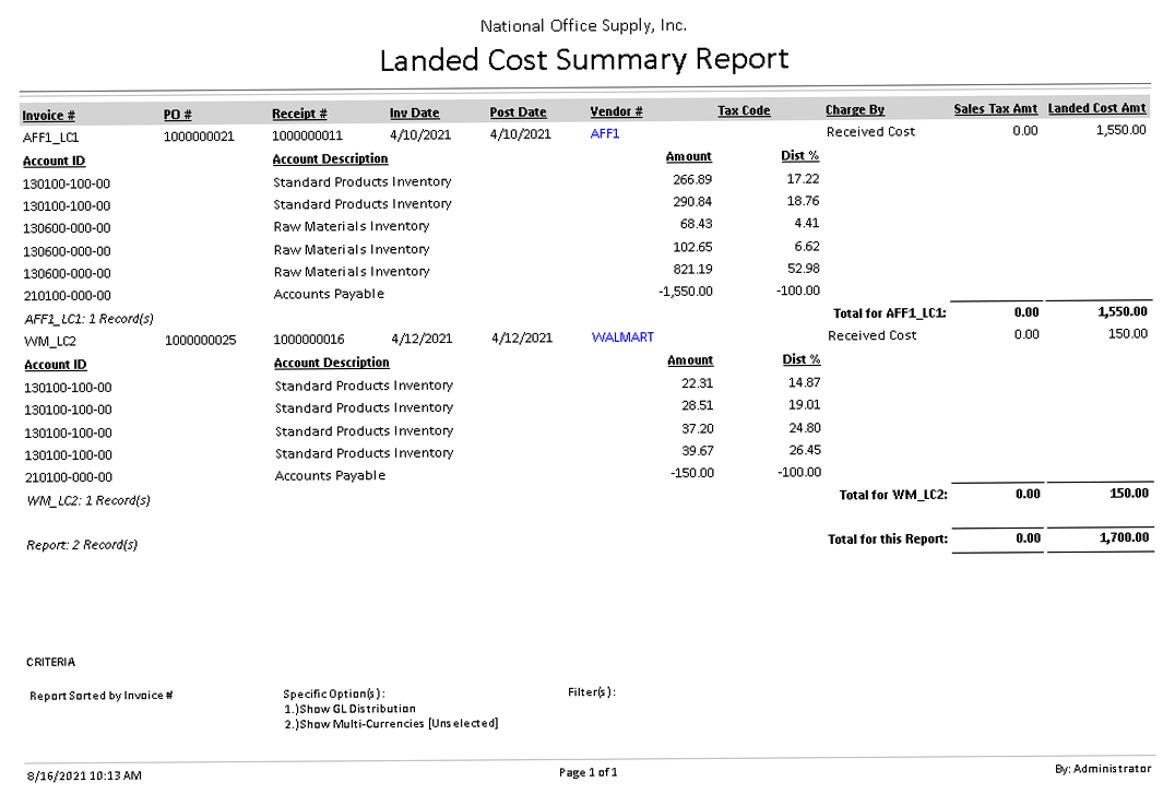 The Landed Cost Reports provide information about the landed cost transactions posted using the Landed Cost Transaction function. These reports have various options and criteria that allows you to generate reports in various formats. Read the information below to get a closer look at each of the Landed Cost Reports available in AccountMate Enterprise. Landed Cost Item Allocation Report The Landed Cost Item Allocation Report provides information on the landed cost allocations to individual inventory items. This report shows the purchase order numbers, receipt numbers, transaction numbers and dates, vendor numbers and company names, and the allocated amounts. This report is useful in determining the allocated landed cost amounts and their distribution to the various line items received from the vendors. You can configure this report to show the journal entries created during posting of landed costs. You can also opt to show multi-currencies in the report.