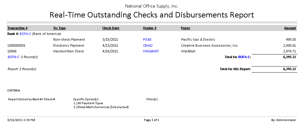 ![]() Real-Time Outstanding Checks and Disbursements Report The Real-Time Outstanding Checks and Disbursements Report provides information on outstanding checks, and other payment transactions entered in the AP module regardless of the date the report is generated. These outstanding checks could mean checks which are yet to be presented at the payee bank for encashment or, if presented, still in the bank’s check clearing cycle. The report is helpful in reviewing the payment status, specifically for those checks that have been printed and released, but not yet recorded as "Reconciled" in AccountMate. You can refer to this report for the outstanding checks/disbursements information to facilitate reconciliation of bank statements against AccountMate records (book balance). You can select to generate this report to show printed checks only, handwritten checks only, electronic payments only, credit card payments only, non-check payments only, or all payment types. You can also opt to show multi-currencies in the report.