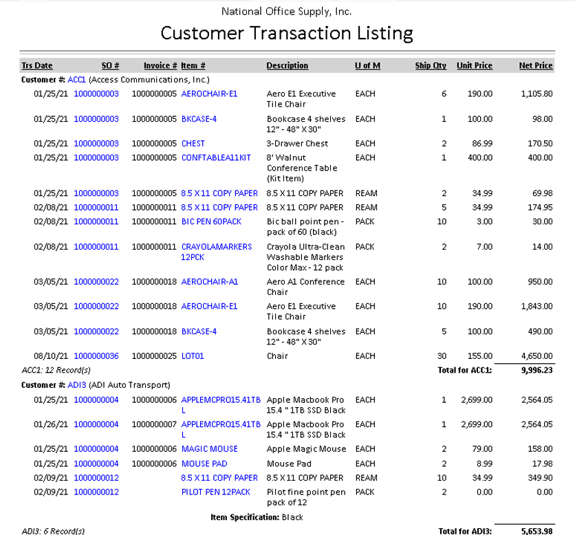 ![]() Inventory Transaction Listing The Inventory Transaction Listing shows the details of inventory item transactions that are recorded in the Sales Order or Accounts Receivable module. This report lists all the inventory item transactions within a specific date range based on the order date, ship date, and/or invoice date. This report is useful for monitoring, reviewing and analyzing sales of the inventory items. You can select to generate this report only for shipments supported with invoices, only for shipments without associated invoices, or for all shipments. You can also opt to show multi-currencies in this report.