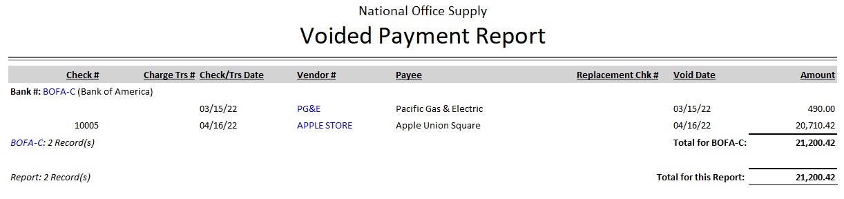 ![]() Voided Payment Report The Voided Payment Report provides information on checks and other payment type transactions that are voided in AccountMate. The report shows information such as the check number, check amount, payee, void date and the replacement check # (if a replacement check was issued). You can use this report and the Payment Register Report to assess the completeness of the checks recorded in AccountMate. You can also verify whether the checks listed in this report match the actual voided checks in your possession. When generating this report, you can select to show printed checks only, handwritten checks only,