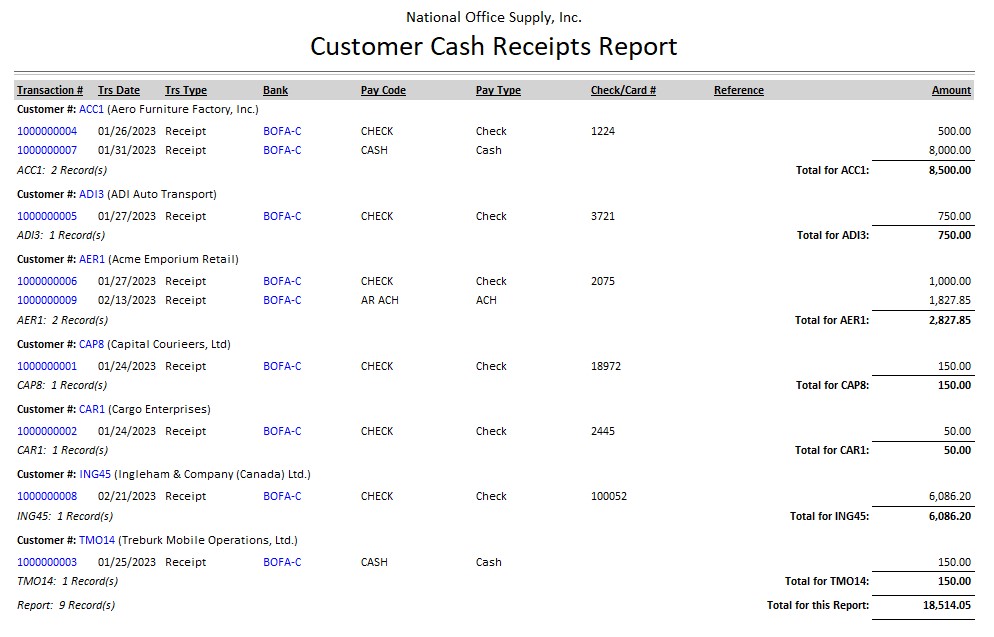 The Receipt Reports provides information on customer payments and how these payments were distributed to invoices. These reports help you focus on a variety of payment data. Each of the Receipt Reports is especially designed with options you can choose that narrows down data to the specific information you need. Read the information below to get a closer look at each of the Receipt Reports available in AccountMate Enterprise. Customer Cash Receipts Report The Customer Cash Receipts Report provides information on customer payments. This report is useful for reviewing customer payment details and for comparing the cash receipts against the bank deposits. You can generate this report to show transactions according to pay types--cash only, check only,