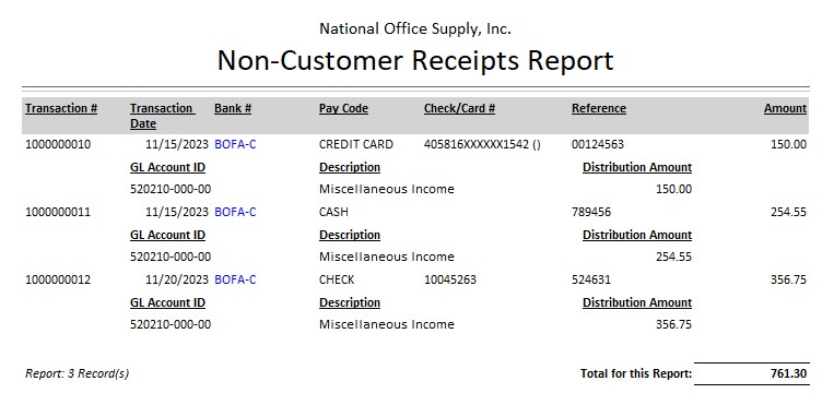 ![]() Non-Customer Receipts Report The Non-Customer Receipts Report provides information on payments from non-customers. This report is useful for reviewing non-customer payment details and for comparing the cash receipts against the bank deposits. You can select to generate this report for non-voided payments only, voided payments only or all payments