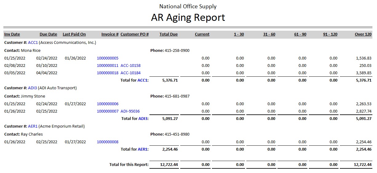 The Receivable Management Reports provides quick access to information concerning your accounts receivables. These reports allow you to review and monitor the status and age of your receivables, open credits, finance charges, and open credit adjustments. These reports can be used to facilitate the review and management of your customer accounts. AccountMate’s National Account Management feature allows you to set up a customer to be a parent or subsidiary account. A parent account can process payments for the subsidiary account. To supplement this feature, some receivable management reports provides an option for you to generate a consolidated report for the subsidiary accounts and their designated parent account. Read the information below to get a closer look at each of the Receivable Management Reports available in AccountMate Enterprise. AR Status Report The AR Status Report provides information on the invoices’ status and balances. This report shows the invoice amount, discount or charge amounts, and other relevant information that indicates the invoice status at one glance. This report is useful for determining the amounts that comprise the invoice balance. It also serves as a supporting document for the AR Aging Report. You can generate this report for sales invoices only, sales returns only or both. You can further select to generate the report for outstanding invoices only, to show the last paid date recorded for each invoice, and to show multi-currencies. Option to generate a consolidated AR status report is also available. This option is applicable only when you are generating the report for an individual customer.
