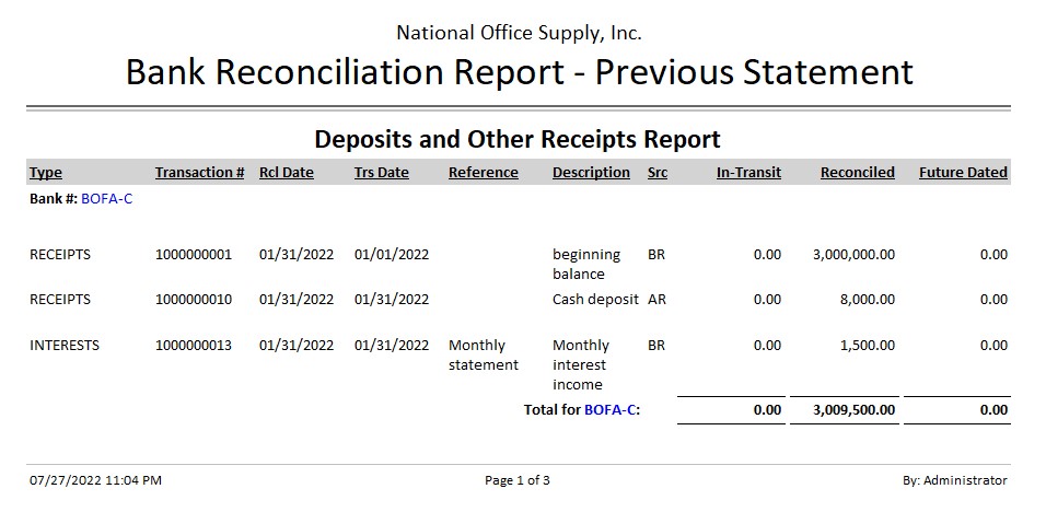 The Bank Reconciliation Report - Previous Statement is a set of reports that provide information about a previously completed and finalized bank reconciliation project processed for a certain bank account. The report shows the exact same information as what would have been shown when reconciliation for that statement period was performed before it was finalized. The report includes bank transactions that would have appeared at the time the bank reconciliation was performed. You must specify a bank # and the Ending Statement Date in order to generate the report. The reports helps in accuracy verification of your bank account reconciliation, and serve as a reference in monitoring bank transactions that were cleared in prior bank statement periods. Deposits and Other Receipts Report This report shows details of all previously reconciled deposits and other receipts transactions included in