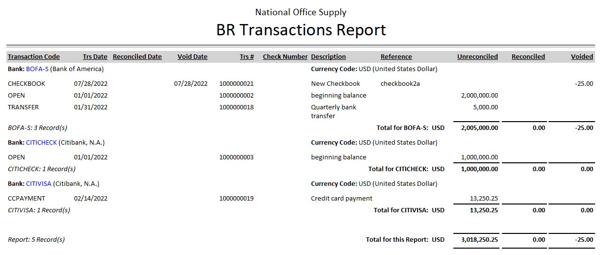 The Bank Transaction Reports provide detailed information on the transactions recorded in the Bank Reconciliation (BR) module only. These reports are useful for reconciling your bank accounts and provide a necessary audit trail. These reports are especially designed to provide filter options so you can generate reports that show the specific information needed. Read the information below to get a closer look at each of the Bank Transaction Reports available in AccountMate Enterprise. BR Transactions Report The BR Transactions Report provides detailed information about transactions recorded in the Bank Reconciliation module only. These transactions include receipts, disbursements, bank transfers, other receipts, and other disbursements which are recorded using the BR module whether they have been marked outstanding, in-transit or reconciled. The report includes information such as the bank code, transaction code, transaction date, reconciled date, transaction #, check number (for checks issues in AP), unreconciled amount and reconciled amount. The report is useful for verifying the accuracy of bank transactions recorded in AccountMate, and serves as reference in reconciling bank accounts. You can generate the report for individual bank accounts or you can opt to generate the report for all or a range
