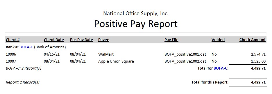 The Positive Pay Report provides detailed information on checks from Accounts Payable