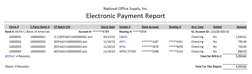![]() AP Electronic Payment Report Electronic funds transfer provides a safer, secure, efficient, and less-expensive-than-paper method of payment to your vendors. AccountMate supports the processing of vendor electronic payments via an online payment system. Generate the AP Electronic Payment Report to obtain detailed information on the amounts paid by