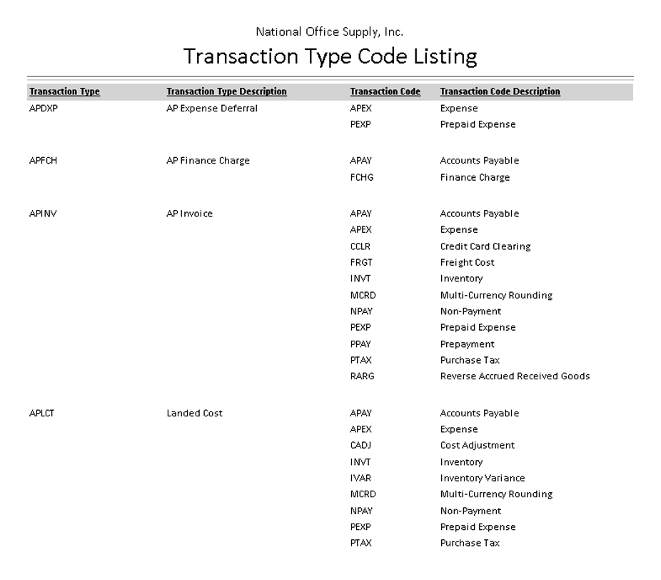 ![]() Transaction Type Code Listing The Transaction Type Code Listing provides information on the user-defined transaction type codes in the system. The report lists all the transaction types and its corresponding transaction type code and description. The report is useful for reviewing the various transaction type codes.