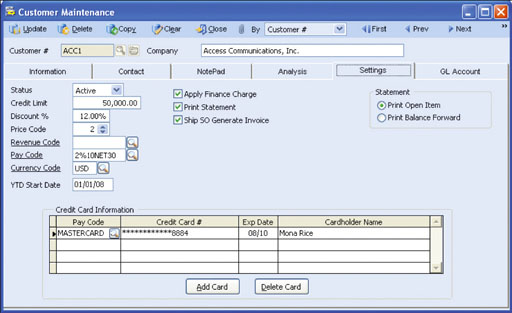 Customer Ledger Card—The Customer Ledger Card provides a snapshot of each customer’s balance by displaying detailed information about sales and credit invoices, partial payments of outstanding invoices, invoice line item distribution, finance charges, taxes, freight, and customer deposits. Credit Card Encryption—Credit card numbers are secured internally so that the ability to view the complete credit card number is restricted to those who have been granted the corresponding access right. If a user does not have the requisite access right, he will see only the last four (4) digits of the credit card number preceded by asterisks (*). Credit card numbers are also encrypted in the database for further security from the IT staff members who may have access to the database but are not granted access to customer credit card information. Comprehensive Inventory Information